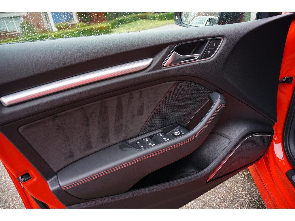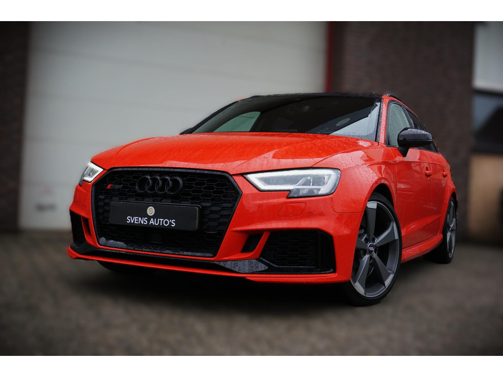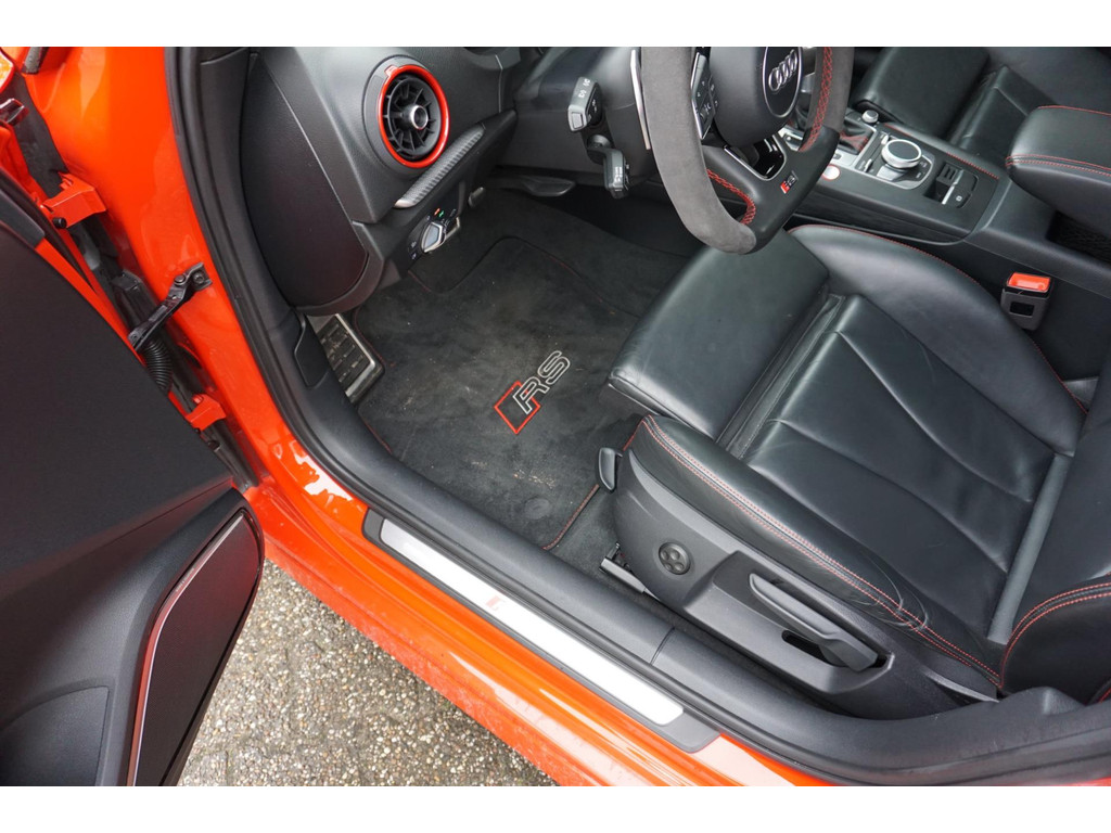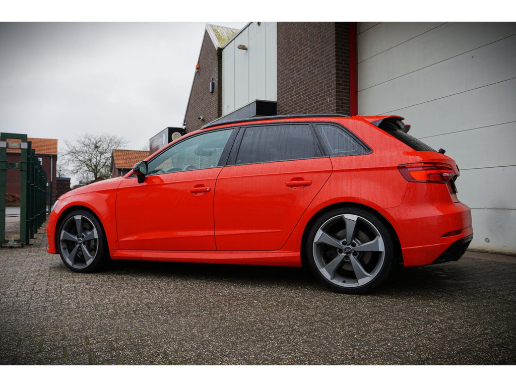 Overcomplete en uiterst sportieve Audi RS3 Sportback! De auto verkeerd in een uitmuntende staat en is netjes onderhouden en bijgehouden! Zeer dikke verschijning in de kleur Catalunya-rood metallic, en het black pakket!