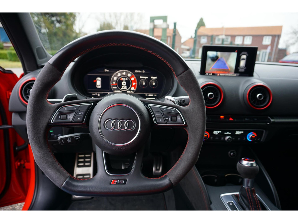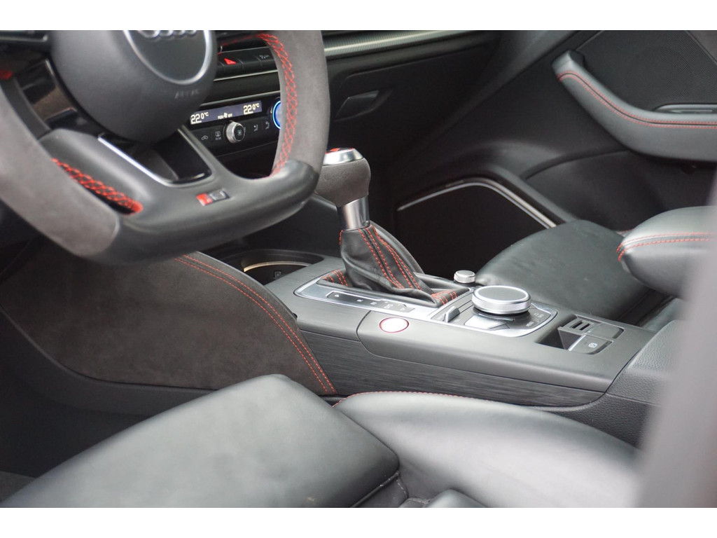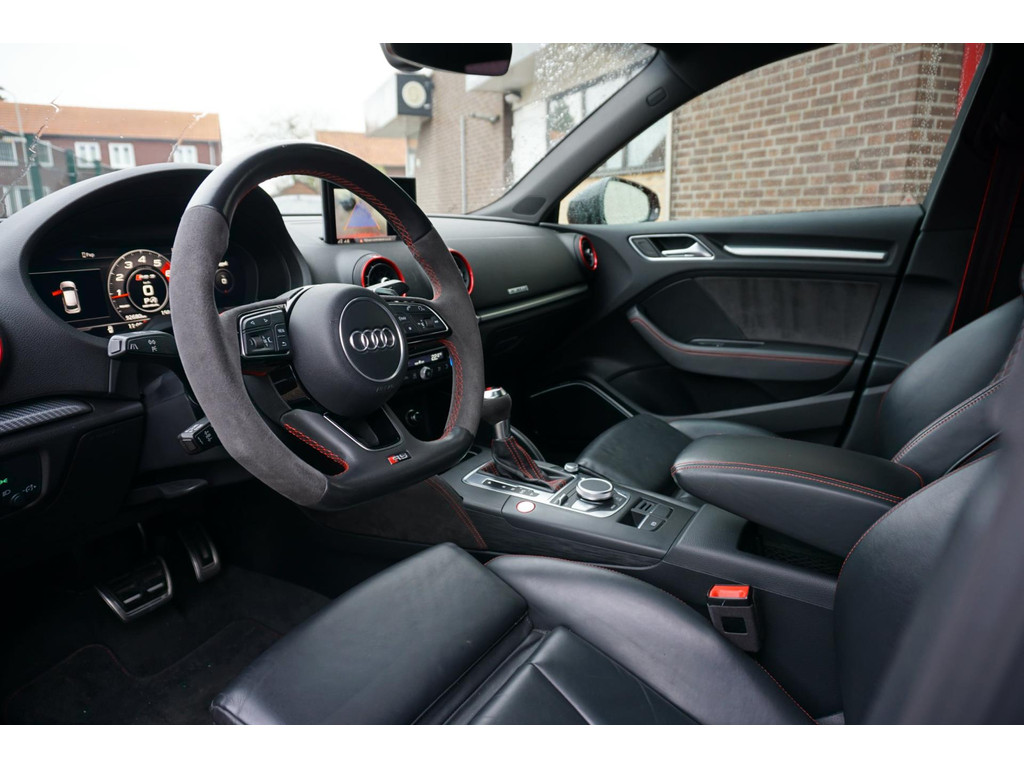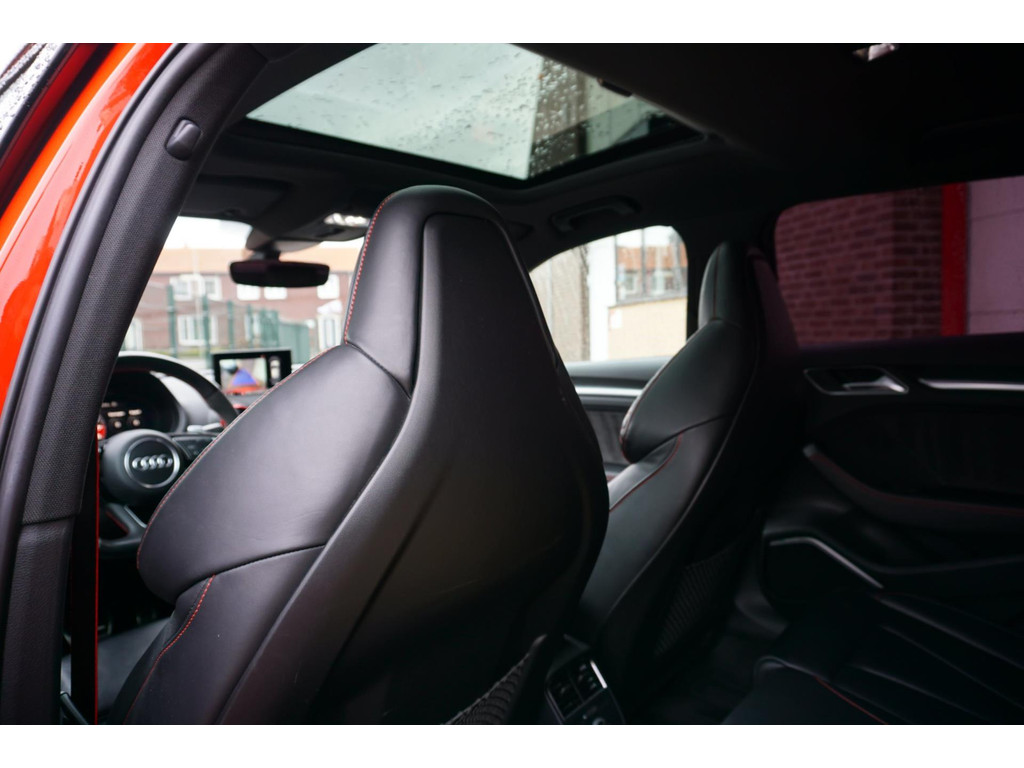 Overcomplete en uiterst sportieve Audi RS3 Sportback! De auto verkeerd in een uitmuntende staat en is netjes onderhouden en bijgehouden! Zeer dikke verschijning in de kleur Catalunya-rood metallic, en het black pakket!